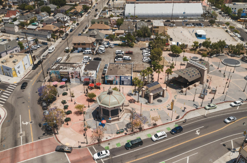 Aerial view of Mariachi Plaza de Los Angeles in Boyle Heights.